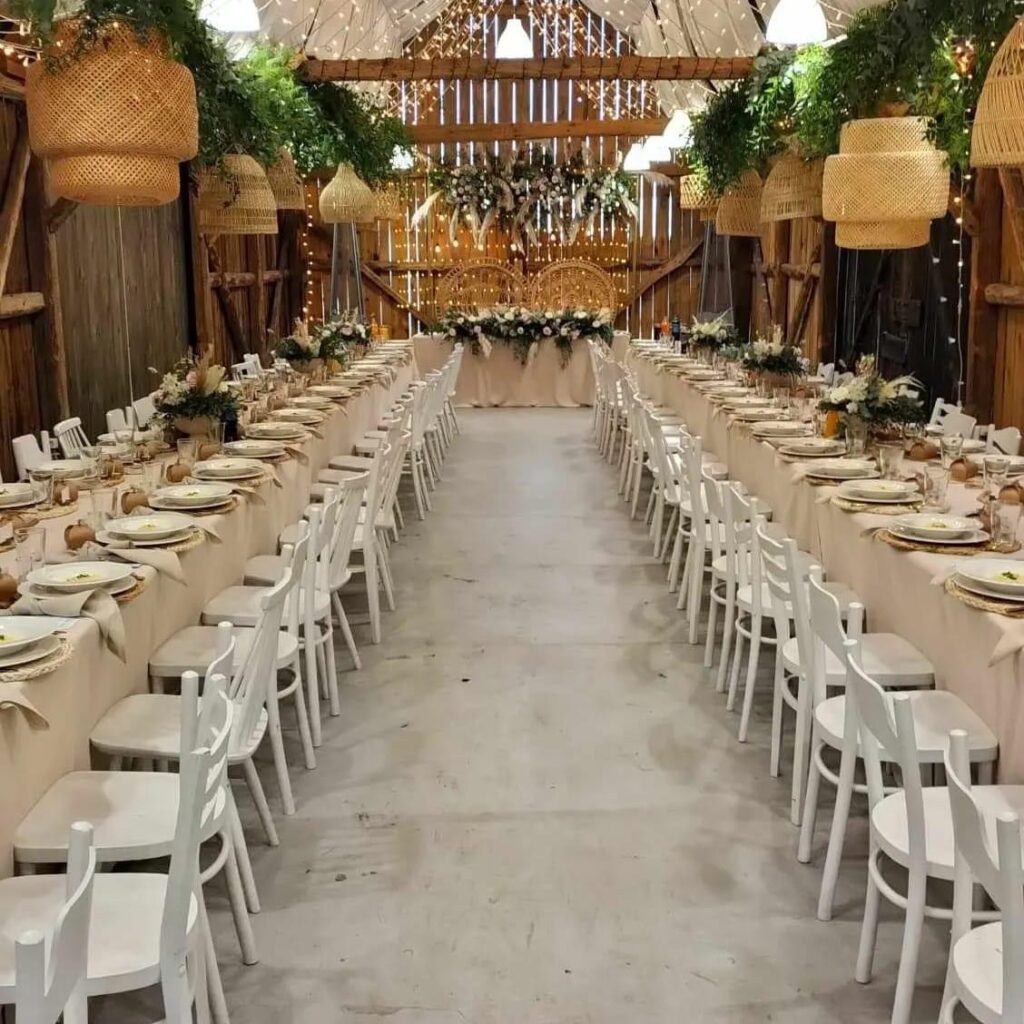 W estetyce scandi nie ma miejsca na nadmiar i chaos w kwestii zdobień. Każde urozmaicenie jest zatem przez nas przemyślane, aby stanowiło praktyczny oraz estetyczny wkład w całość. Stonowana biel idealnie komponuje się z jasnym drewnem, tworząc atmosferę przytulności, kojarzącą się głównie z zaciszem domowym. To piękna przestrzeń na organizację wesela – opisywana sala weselna sprawia, że goście czują się swobodnie i swojo, ich wzrok nie mierzy się z nadmiarem bodźców.