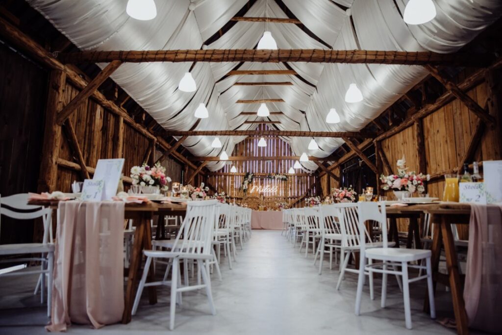 W estetyce scandi nie ma miejsca na nadmiar i chaos w kwestii zdobień. Każde urozmaicenie jest zatem przez nas przemyślane, aby stanowiło praktyczny oraz estetyczny wkład w całość. Stonowana biel idealnie komponuje się z jasnym drewnem, tworząc atmosferę przytulności, kojarzącą się głównie z zaciszem domowym. To piękna przestrzeń na organizację wesela – opisywana sala weselna sprawia, że goście czują się swobodnie i swojo, ich wzrok nie mierzy się z nadmiarem bodźców.